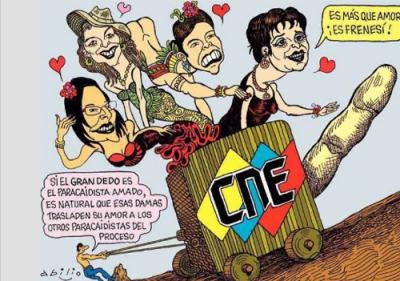 Mario Silva mostró en La Hojilla una nueva caricatura publicada en el diario Tal Cual por Abilio en la que se detalla a las rectoras del Consejo Nacional Electoral vestidas con trajes de cabaret, y una de ellas casi totalmente desnuda, montadas sobre un carro de madera que tiene una figura alargada y erecta, que más que parecer un dedo tiene similitud con el órgano sexual masculino.